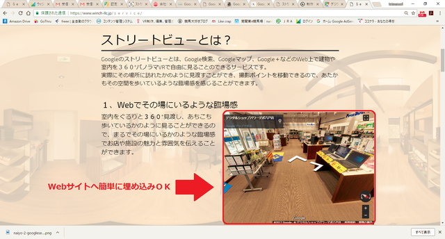 ストリートビューで公開している360°VRはYoutube等と同様に簡単に自社のホームページやブログ等に埋め込んだり、リンクを張り付けたりすることができます。